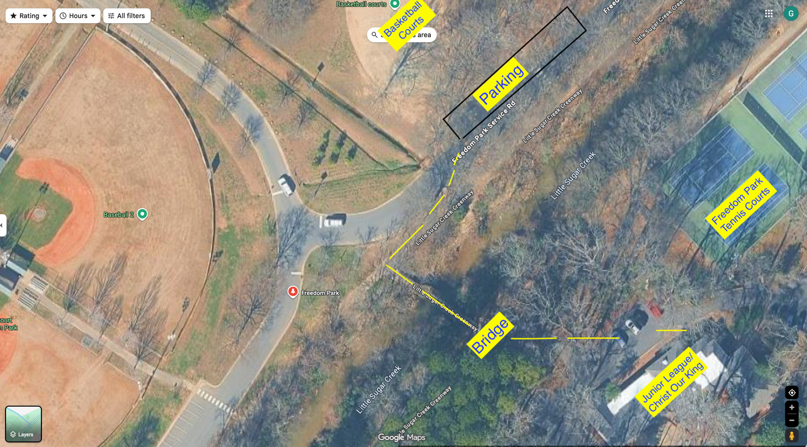 There is additional parking at Freedom Park, right in front of the basketball courts when you enter Freedom Park. To park here, exiting the parking lot by the tennis courts, turn left on East Blvd, turn left into Freedom Park, and park in the spaces in front of the basketball court on the right. From there it is a less than a minute walk from those parking space to our worship facility following the map across the bridge.